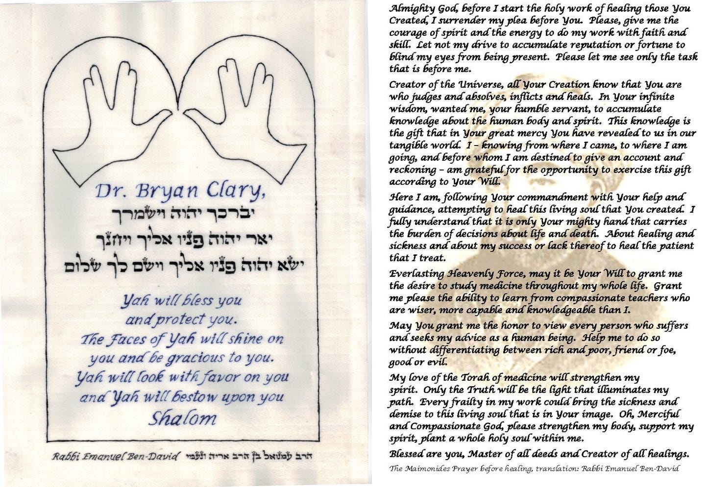 I was ready to enter the Operating Theater when Dr. Clary came to make sure that all is properly done. I gave him a paper with the prayer that the Maimonides recited before he started his work as a physician. Dr. Clary read it with deep intent and then said: ‘I have two things to tell you. The first is that there is not a single word that I disagree with. The second is that I can use all the help I can get from any source’. There were not enough words to express the gratitude I felt for him at that moment. After my third successful surgery, I presented him with the prayer long with the Priestly Blessing on parchment.